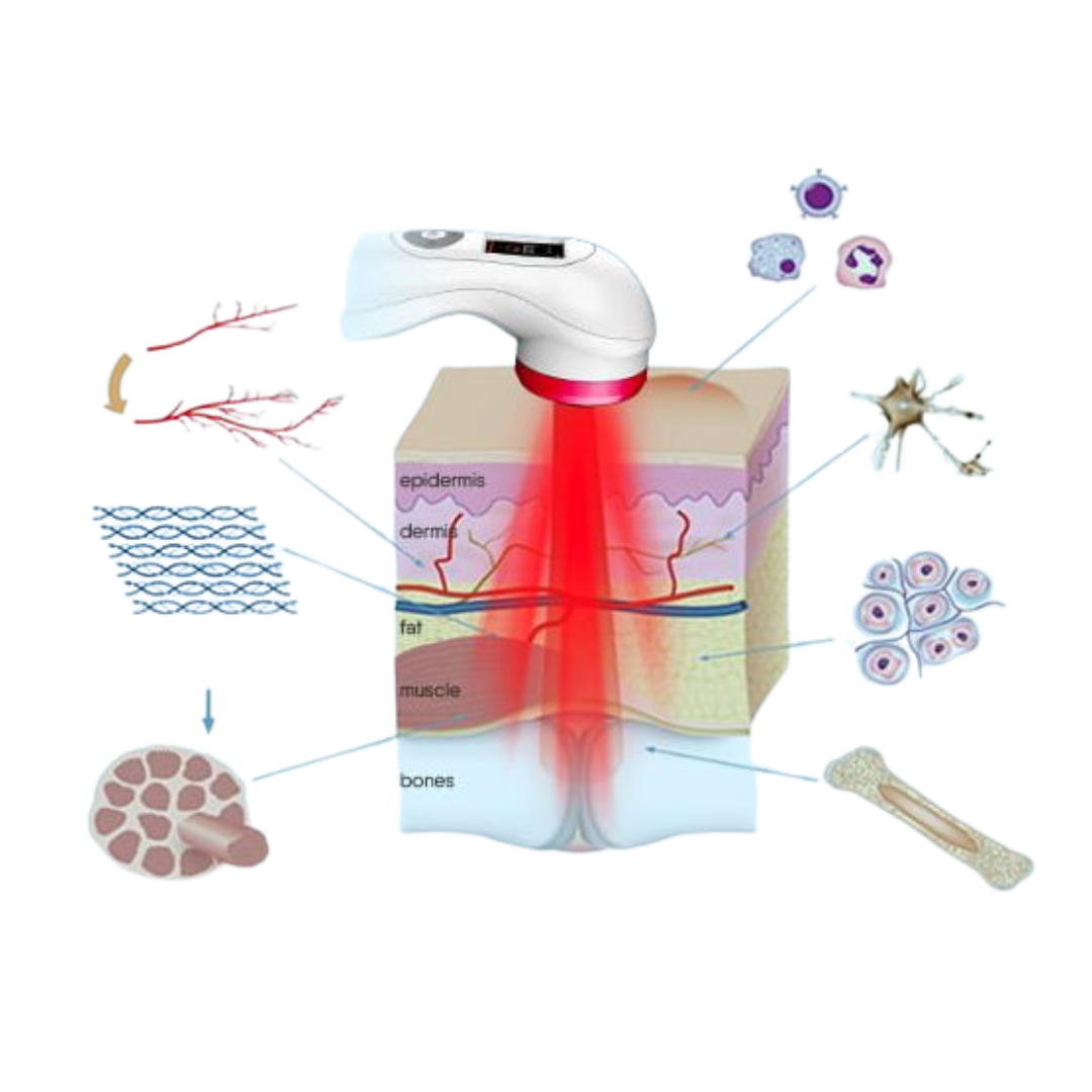 • 808 nm diodes (5 units, ~250 mW each) reach deeper musculature, tendons, ligaments